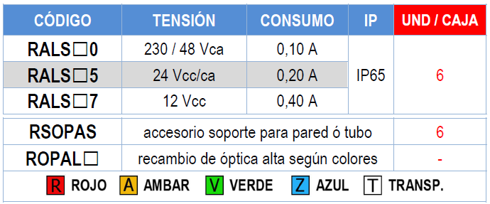 Óptica en policarbonato de varios colores: rojo, ámbar, verde, azul y transparente.