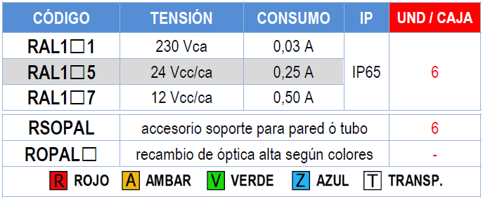 Óptica en policarbonato de varios colores: rojo, ámbar, verde, azul y transparente.