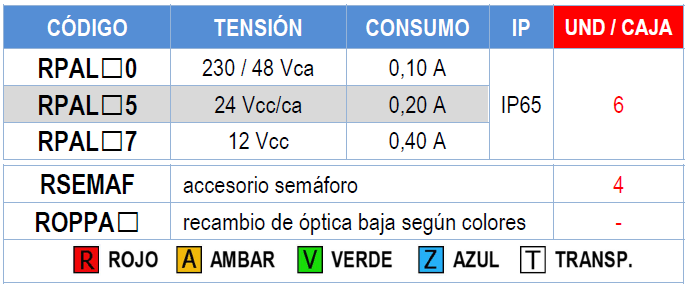 Óptica baja en policarbonato de varios colores: rojo, ámbar, verde, azul y transparente.